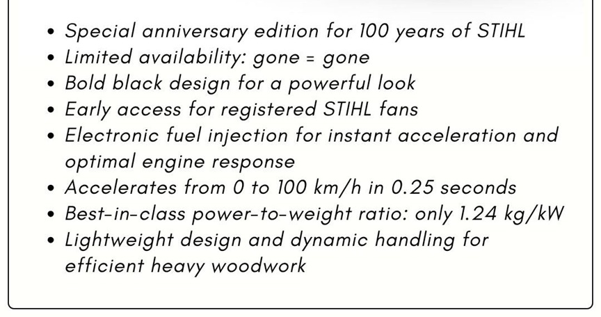 - The first high-power chainsaw worldwide with an electronic fuel injection system